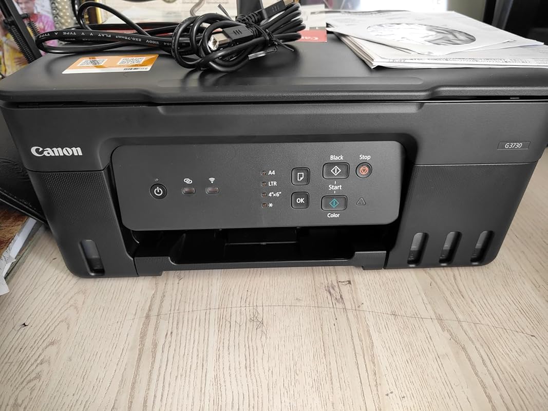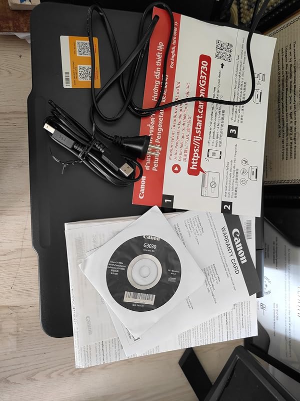 The Canon Pixma G3730 printer offers a hassle-free installation experience. The included software is user-friendly, and the print quality—both text and color—is impressive for home and light office use.That said, the packaging could have been better. The outer box appeared worn and gave the impression of a returned or old unit. Thankfully, the internal components were neatly packed and undamaged. The ink bottles provided filled only about half the tank, which felt insufficient for first-time use.The printer features splash-proof refill chambers and comes with a power cord, USB cable, installation CD, two sheets of safety instructions and notices, and a QR setup link (which, unfortunately, didn’t work). I had to download the drivers directly from Canon’s website. The product also comes with a 2-year warranty—I’ve registered online and am awaiting confirmation.Suggestion: The seller should wrap the package in a plastic sleeve or protective layer to preserve the original box during shipping. Also, the manufacturer must consider providing enough ink to fully fill the tanks for a better first-use experience. Lastly, ensure all QR setup links are functional.
