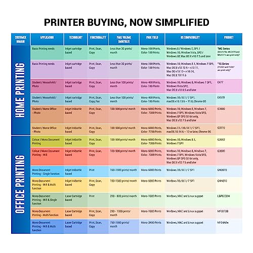 About this item Printer type: Inktank ; Functions: Print only ; Printer output: Monochrome ; Connectivity: Wifi, USB ; Scanner: No ; Scanner resolution: No OS Compatibility: Windows 10 / 8.1 / 7 SP1 (Operation can only be guaranteed on a PC with a pre-installed Windows 7 or later) ; Mobile connectivity : Yes (via Canon Print Service, PIXMA Cloud Link, Canon PRINT Inkjet/SELPHY) ; Hardware Interface: Hi-Speed USB 2.0 ; Enlarge/reduce option: No ; Duplex: No Maximum Print Speed (color): NA, Maximum Print Speed (Monochrome): 13.0 ipm ; Print cost Monochrome: Rs 0.12 ; Print cost color: NA ; Maximum Print Resolution: 600 x1200 dpi Page size :A4, A5, B5, LTR, LGL, Envelopes ; Max paper thickness: 64 to 275 GSM; Maximum Input Sheet Capacity: 100 sheets (A4) ; Compatible ink: GI-70 Black ; Additional Printer Function: Optional color print Power wattage of printer:OFF: Approx. 0.3 W, Standby (scanning lamp is off) USB connection to PC: Approx. 0.8W, Standby (all ports connected, scanning lamp is off): Approx. 1.6W , Printing USB connection to PC: Approx. 13W Special Features: Optional Colour Print ; Ideal Usage: Home office; Included Components: Printer, Power Cord, USB cable, Instruction Manual, 1 Bottle of GI70 Black ink Warranty – 1 year warranty from the date of purchase.Use only genuine Canon ink. Using counterfeit ink will harm your printer as well as render your warranty void